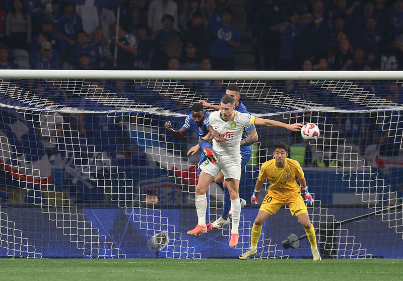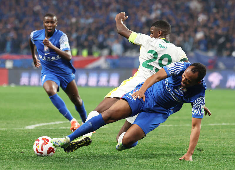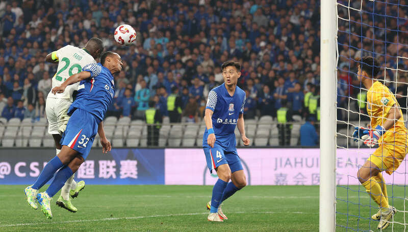 3月1日,上海体育场,2025中超联赛上海申花队对北京国安队的比赛中,国安队29号外援法比奥(左一)在比赛补时阶段头球攻门为本队扳平比分。刘占崑/摄