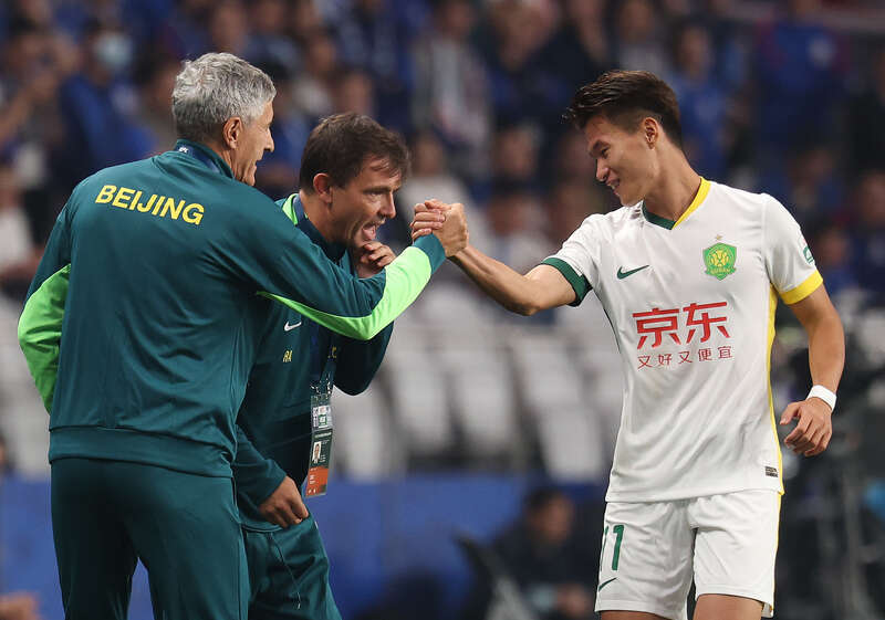 3月1日,上海体育场,2025中超联赛上海申花队对北京国安队的比赛中,北京国安队主教练塞蒂安(左)鼓励为本队首开记录的11号林良铭(右)。刘占崑/摄