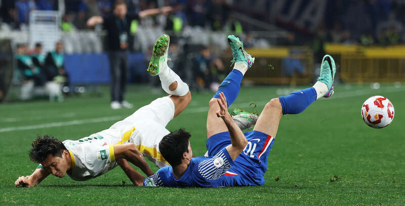 3月1日,上海体育场,2025中超联赛上海申花队对北京国安队的比赛中,国安队21号张源(左)与申花队10号外援特谢拉倒地争夺。刘占崑/摄